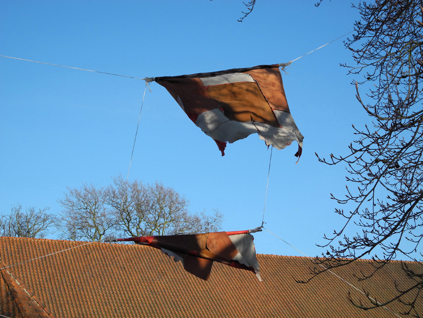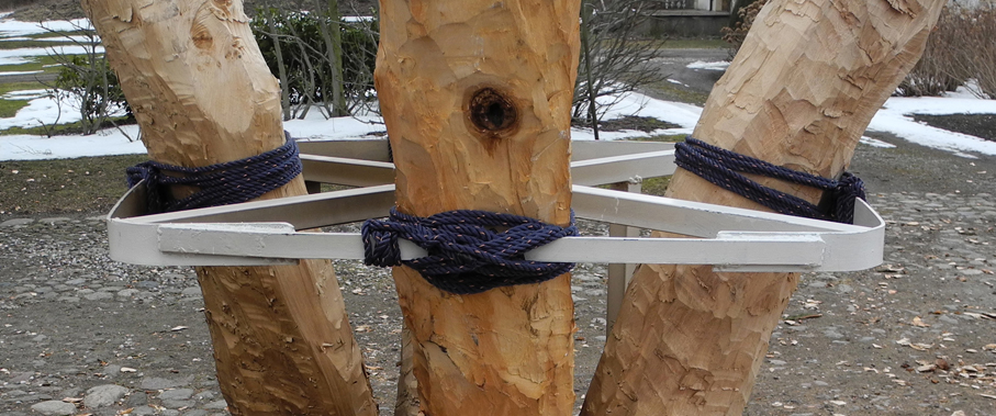 Installation: Wood from ash, willow, alder, oak, pine and chestnut, metal, bones from pig, cow, ox and reindeer, chains, leather, flagpole rope.