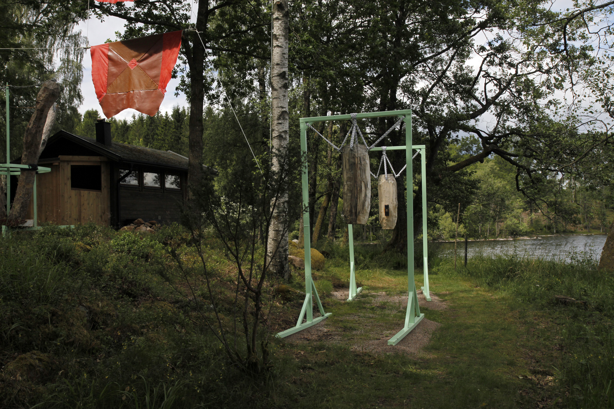Installation: Wood from ash, willow, alder, oak, pine and chestnut, metal, bones from pig, cow, ox and reindeer, chains, leather, flagpole rope.